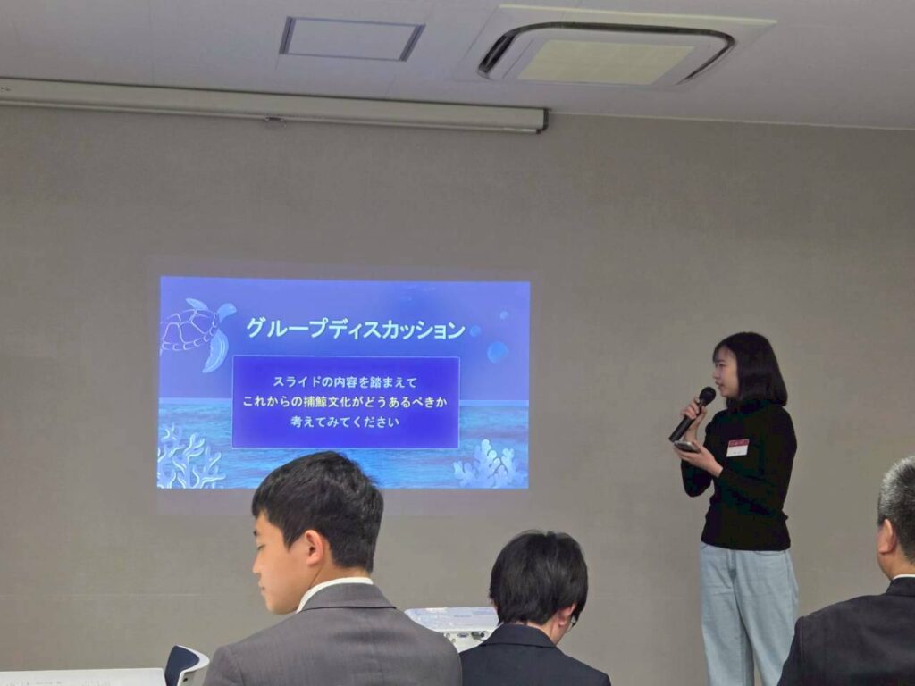 後半のグループディスカッションでは、「クジラ一頭の価値」について意見を交わしました。 古くからの伝統を守り抜こうとする日本の姿勢と、価値観をアップデートし続ける海外の考え方。それぞれの正義や文化の違いについて、メンバー同士で多角的な視点から活発な議論が展開されました。